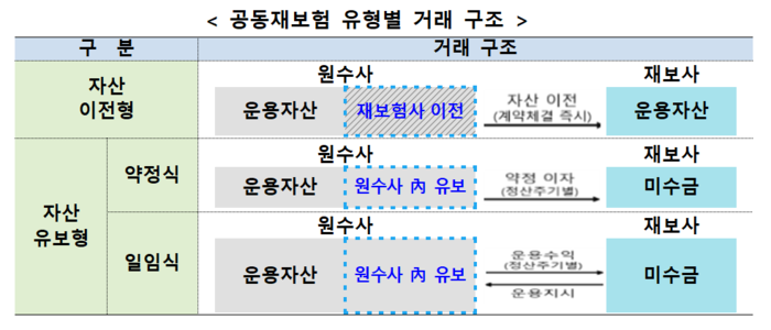 기존엔 공동재보험 거래방식이 △자산이전형과 △자산유보형(약정식)으로 나뉘었다. 자산이전형은 보험사의 자산이 재보험사로 아예 옮겨지는 형태다. 재보험사가 자산을 보유하기에 운용을 하기도 쉽다. 혹시 모를 위험을 나누기 위한 조치지만 재보험사가 망하면 보험사도 같이 크게 흔들리는 게 단점이다.
