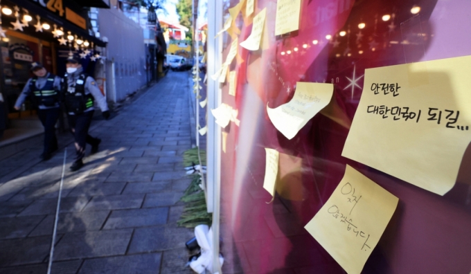 10.29 이태원 참사 3주기를 하루 앞둔 28일 서울 용산구 이태원참사 골목에 마련된 추모 게시판에 시민들이 남겨놓은 글귀가 붙어 있다. /사진=뉴스1. |