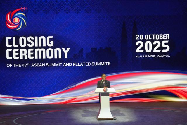 올해 아세안(ASEAN·동남아시아국가연합) 정상회의 의장국인 말레이시아의 안와르 이브라힘 총리가 28일 말레이시아 쿠알라룸푸르에서 열린 폐막식에서 연설하고 있다. 쿠알라룸푸르=AP 연합뉴스 |