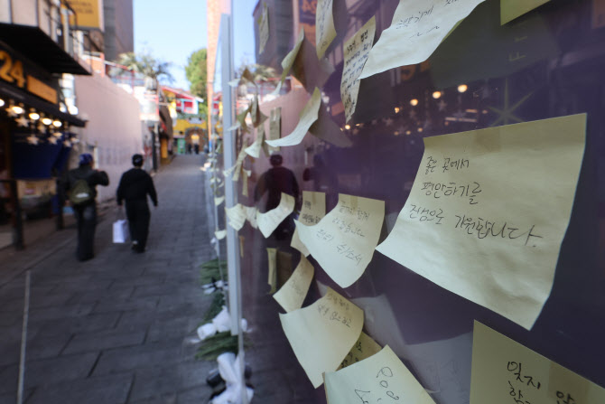 10.29 이태원 참사 3주기를 하루 앞둔 28일 서울 용산구 이태원역 1번 출구 인근 참사 현장에 마련된 ‘10.29 기억과 안전의 길’에 추모메시지들이 붙어있다.(사진=연합뉴스) |