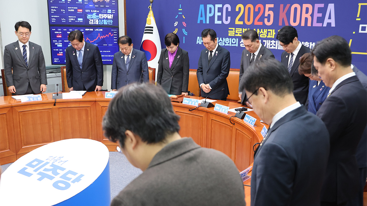 ▲ '10·29 이태원 참사' 3주기인 29일 서울 여의도 국회에서 열린 더불어민주당 최고위원회의에서 정청래 대표와 김병기 원내대표 등 참석자들이 추모 묵념을 하고 있다.