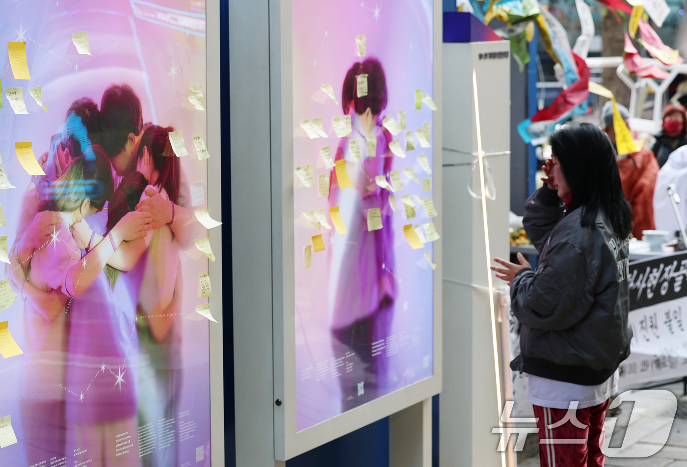 (서울=뉴스1) 오대일 기자 = 10·29 이태원 참사 3주기를 맞은 29일 오전 서울 용산구 이태원 참사 현장 골목에서 한 시민이 추모 메시지를 읽으며 눈물짓고 있다. 2025.10.29/뉴스1