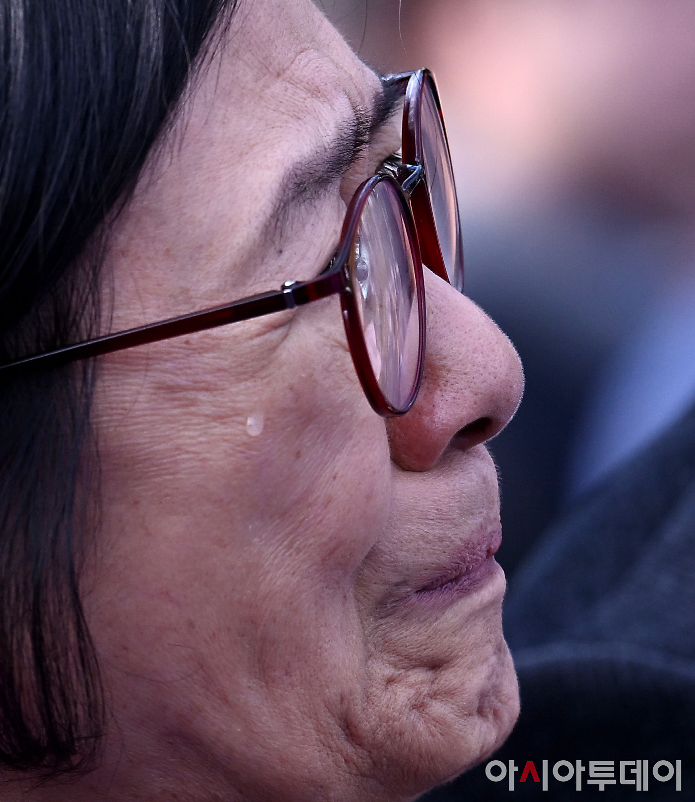아시아투데이 박성일 기자 = 이태원 참사 유가족이 29일 오전 서울 중구 광화문광장에서 열린 10.29 이태원 참사 3주기 기억식에 참석해 눈물을 흘리고 있다.