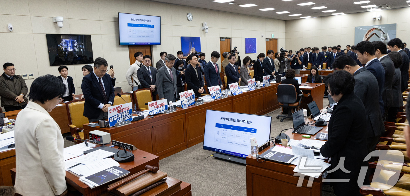 (서울=뉴스1) 이승배 기자 = 29일 서울 여의도 국회에서 열린 과학기술정보방송통신위원회 과학기술정보통신부 등에 대한 국정감사에서 이태원 참사 3주기 추모 사이렌에 맞춰 참석자들이 묵념하고 있다. 2025.10.29/뉴스1