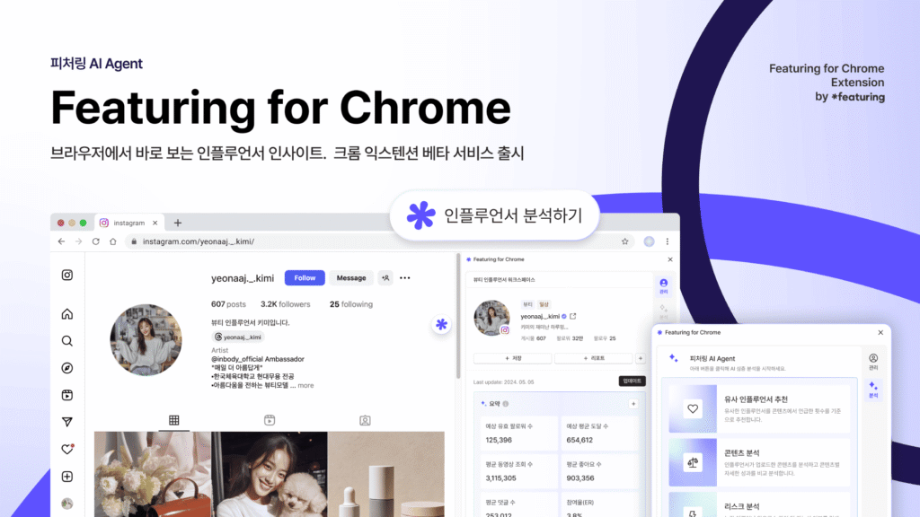 글로벌 SNS 데이터 분석 기업 피처링이 AI 올인원 인플루언서 마케팅 솔루션 '피처링'을 구글 크롬 웹브라우저에서 사용할 수 있는 확장 프로그램 'Featuring for Chrome' 베타 서비스를 출시했다.