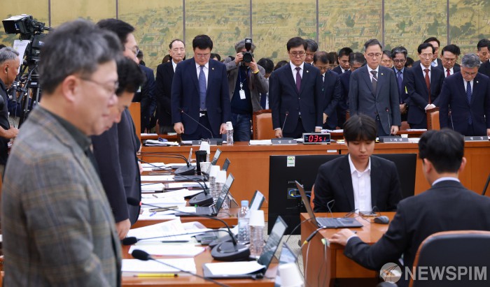 [서울=뉴스핌] 김학선 기자 = 최휘영 문화체육관광부 장관 등 증인들이 29일 서울 여의도 국회에서 열린 문화체육관광위원회의 문화체육관광부, 국가유산청 등 종합감사에서 10.29 이태원참사 희생자를 위한 추모 사이렌이 울리자 묵념을 하고 있다. 2025.10.29 yooksa@newspim.com