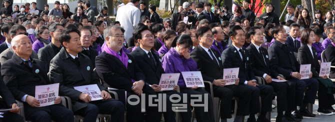 [이데일리 이영훈 기자] 10·29 이태원 참사 3주기를 맞은 29일 서울 종로구 광화문광장에서 열린 '이태원참사 3주기 기억식'에서 우원식 국회의장, 김민식 국무총리를 비롯한 송해진 유가족협의회 운영위원장, 송기춘 이태원 참사 특별조사위원회 위원장 등 참석자들이 묵념하고 있다.