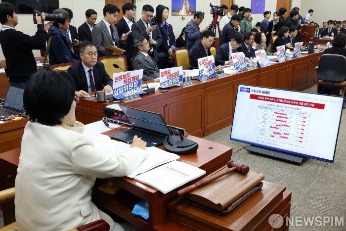 [서울=뉴스핌] 정일구 기자 = 29일 오전 서울 여의도 국회 과학기술정보방송통신위원회에서 열린 과학기술정보통신부 등에 대한 종합감사에서 국민의힘 의원들이 최민희 위원장 사퇴를 촉구하는 피켓을 노트북에 게시하고 있다. 2025.10.29 mironj19@newspim.com