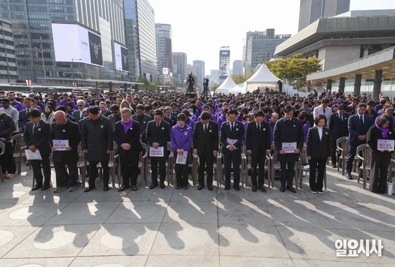 이태원 참사 3주기를 맞아 29일 오전 서울 종로구 광화문광장에서 열린 ‘10·29 이태원 참사 3주기 기억식’에 참석자들이 희생자들을 추모하는 묵념을 하고 있다.