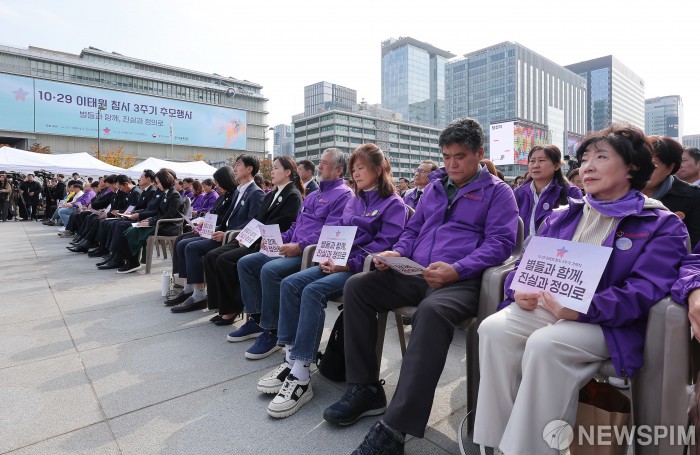 [서울=뉴스핌] 이길동 기자 =29일 서울 종로구 광화문광장에서 10.29 이태원 참사 3주기 기억식이 진행되고 있다.2025.10.29 gdlee@newspim.com