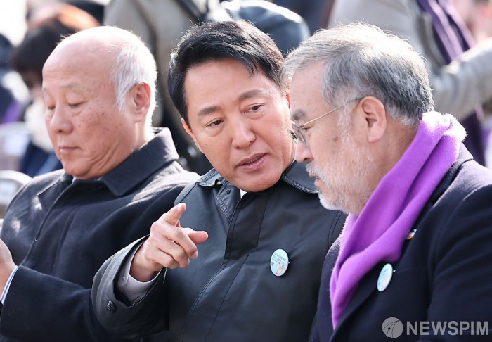[서울=뉴스핌] 이길동 기자 = 오세훈 서울시장이 29일 서울 종로구 광화문광장에서 열린 10.29 이태원 참사 3주기 기억식에서 송기춘 이태원 참사 특조위원장과 대화하고 있다.2025.10.29 gdlee@newspim.com