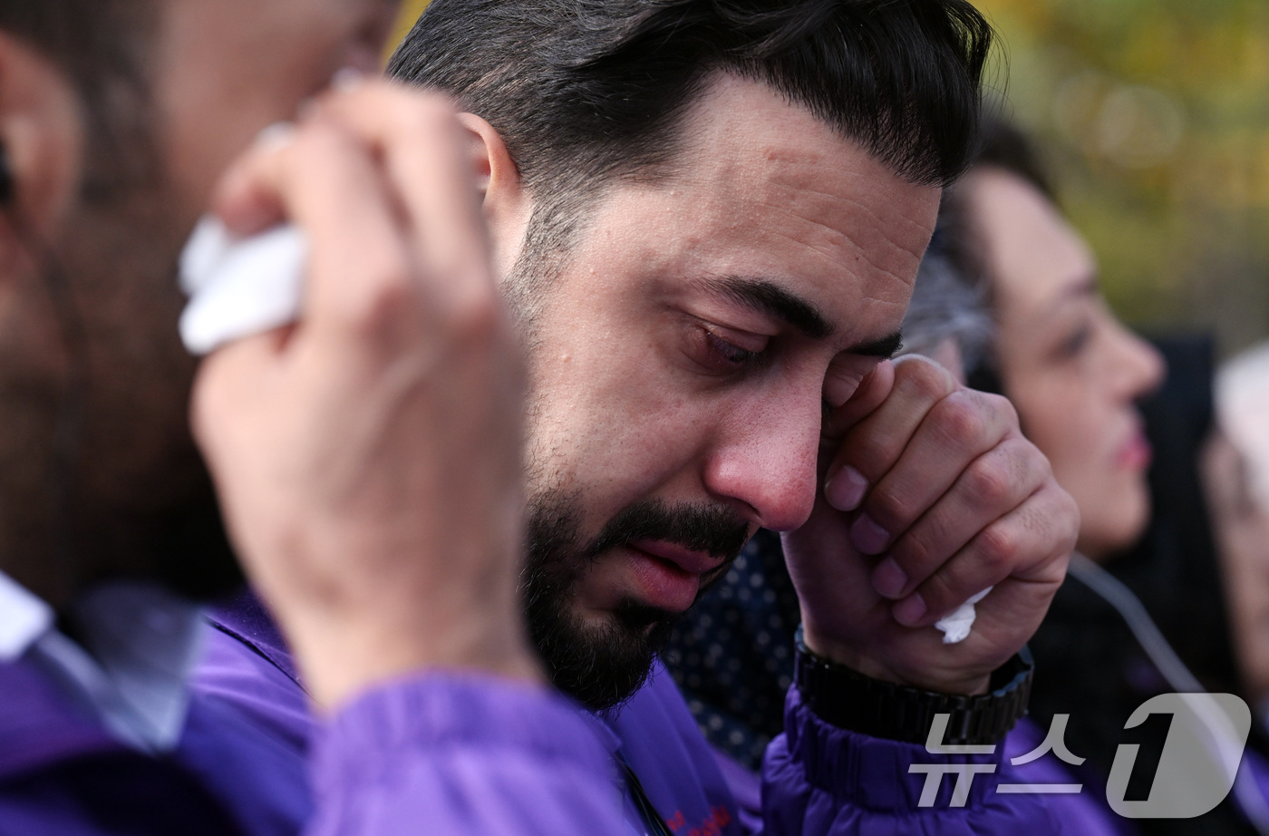 (서울=뉴스1) 김성진 기자 = 29일 서울 종로구 광화문광장에서 열린 10.29 이태원 참사 3주기 기억식에서 한 외국인 유가족이 눈물을 닦고 있다. 2025.10.29/뉴스1