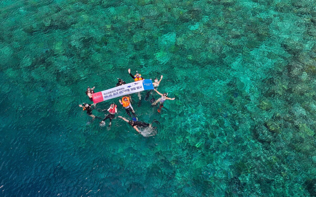 29일(현지시간) 인도네시아 마나도 부나켄 해양국립공원에서 이스타항공의 인천-마나도 첫 편을 통해 도착한 관광객들이 스노쿨링과 다이빙을 즐기며 기념촬영을 하고 있다. 마나도 부나켄 해양국립공원은 맑은 바다 속에서 1,300종 이상의 해양 생물과 370여 종의 살아있는 산호초 등을 맨 눈으로 감상할 수 있어 세계 3대 다이빙 성지로 불린다.