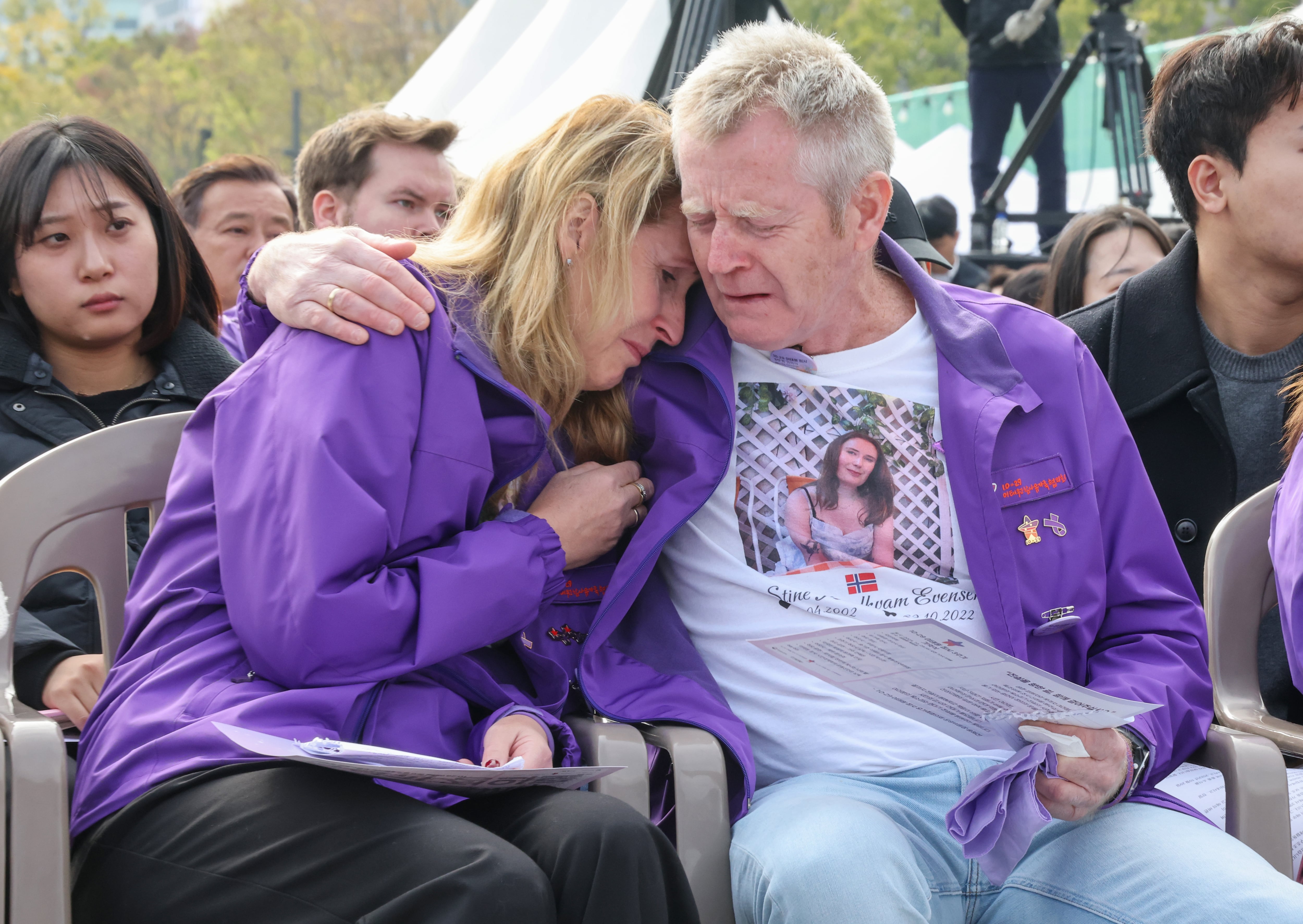 고 스티네 로아크밤 에벤센 씨의 부모가 29일 오전 서울 종로구 광화문 북광장에서 열린 이태원 참사 3주기 기억식에 참석해 딸을 회상하며 눈물을 흘리고 있다. /박성원 기자 |