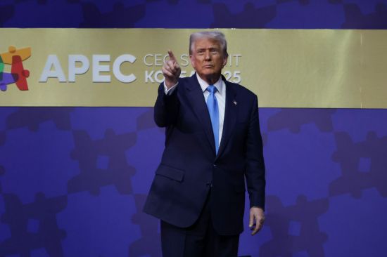 도널드 트럼프 미국 대통령이 29일 경북 경주 예술의전당에서 열린 '2025 아시아태평양경제협력체 최고경영자 서밋(APEC CEO SUMMIT)'에서 연설을 마치고 퇴장하고 있다. 연합뉴스 |