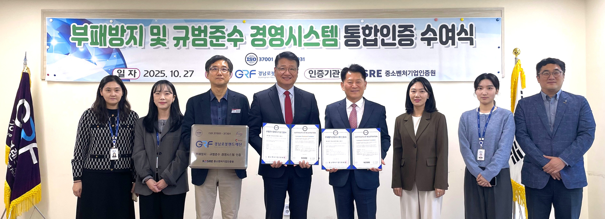 중소벤처기업인증원(원장 엄진엽, KOSRE)은 (재)경남로봇랜드재단(원장 최원기)이 ‘ISO 37001(부패방지경영시스템)·37301(규범준수경영시스템)’ 통합 인증을 획득했다고 밝혔다.
