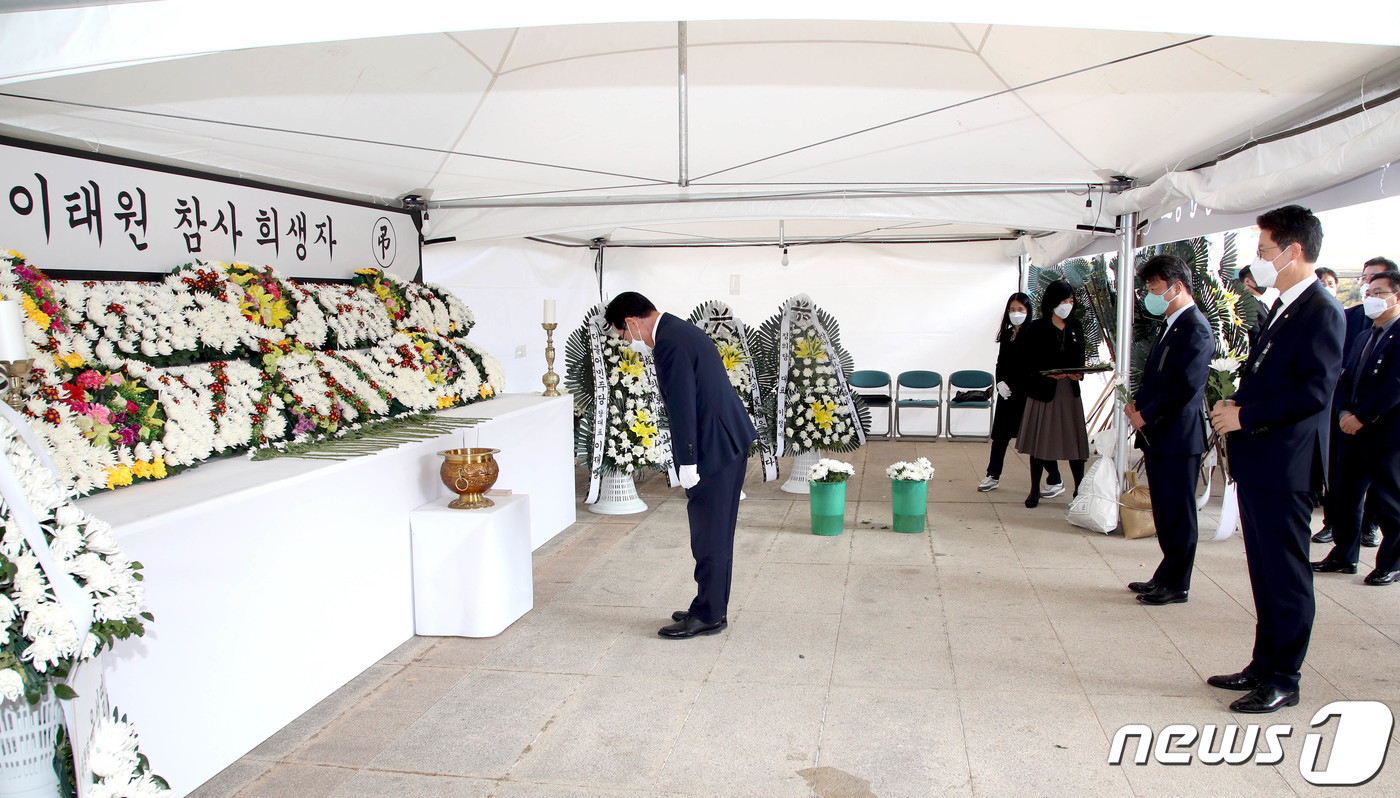 전남도청 만남의 광장에 설치된 ‘이태원 참사 희생자 합동분향소’로 명칭이 변경된 3일 김영록 전라남도 도지사를 비롯한 간부들이 분향소를 방문해 조문하고 있다.(전남도 제공) 2022.11.3/뉴스1 |