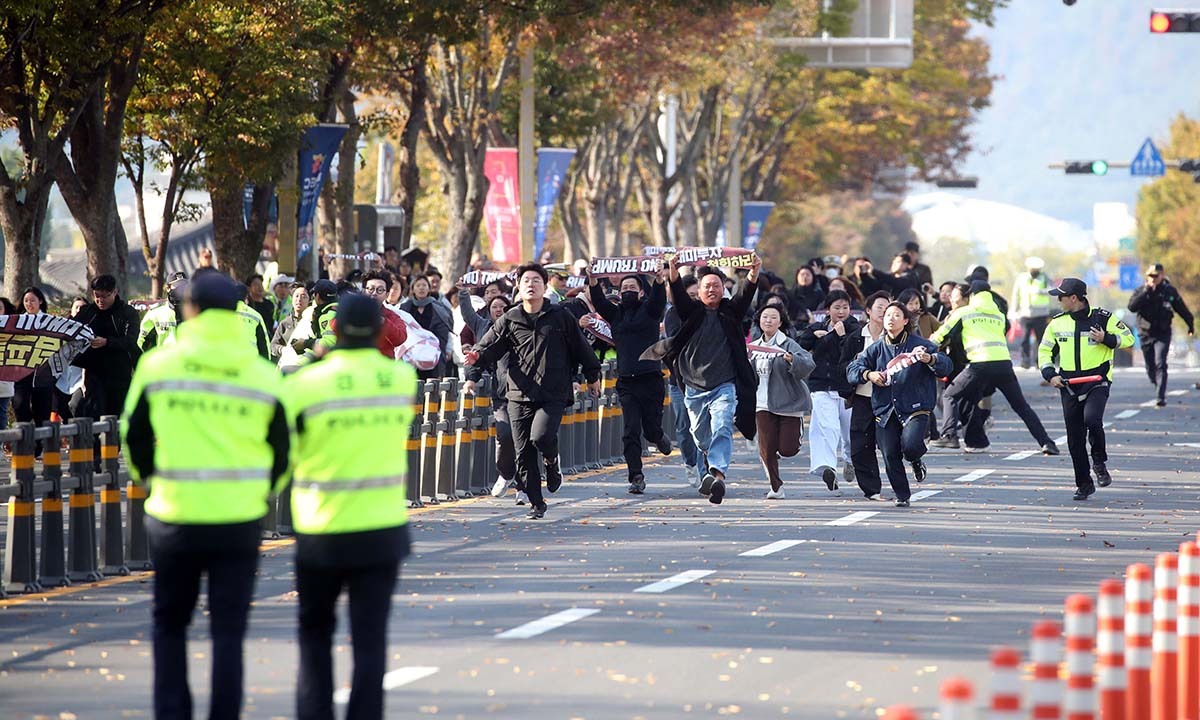 29일 한미 정상회담이 열린 국립경주박물관 인근에서 도널드 트럼프 미국 대통령을 반대하는 기습 시위대가 경찰저지선을 뚫고 정상회담장으로 질주하고 있다. 연합뉴스 |
