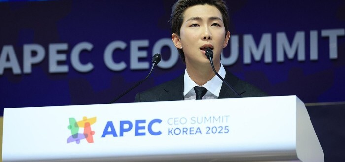 그룹 방탄소년단(BTS)의 리더 RM이 29일 경북 경주 예술의전당에서 열린 '2025 아시아태평양경제협력체 최고경영자 서밋(APEC CEO SUMMIT)'에 참석해 'APEC 지역 내 문화산업과 K-컬처 소프트파워'를 주제로 연설하고 있다. 연합뉴스 |