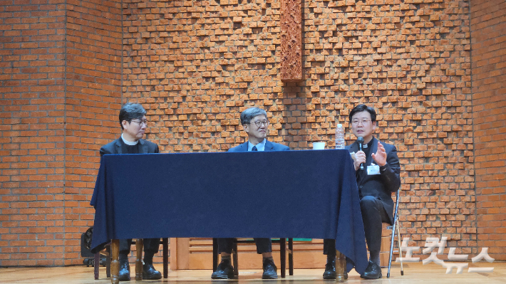 장로회신학대학교(총장 박경수)가 지난 23일 한경직기념예배당에서 니케아 신조 1700주년을 맞아 종교개혁과 에큐메니칼 정신을 주제로 학술강좌를 개최했다. 왼쪽부터 성공회 주낙현신부, 장신대 서원모 교수, 루터교 최주훈 목사가 발제자로 나섰다. 송주열 기자 |