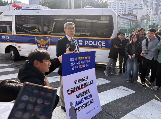 정근식 서울시교육감이 29일 소녀상 철거 집회가 예고된 서울시내 한 고등학교 앞에서 입장을 밝히고 있다. 이날 보수 성향 단체 위안부법폐지국민행동은 소녀상이 설치된 서울 성동구서초구 고등학교 앞에서 집회를 예고했으나, 경찰의 금지 통고와 물리적 제지로 무산됐다. 연합 |