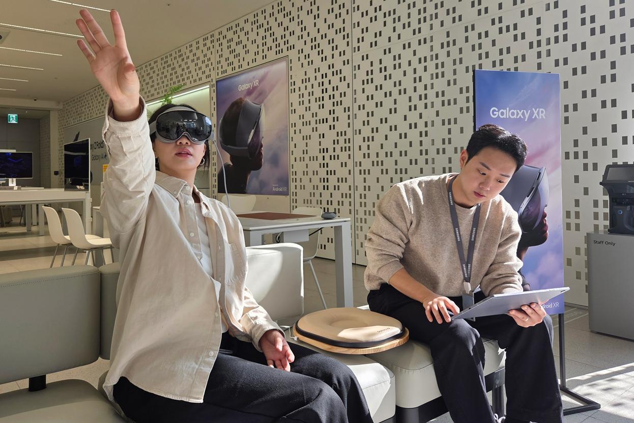 29일 서울 마포구 삼성스토어 홍대에서 체험자 한 명이 헤드셋 형태의 ‘갤럭시 XR’을 쓰고 직접 체험을 하고 있다. 전국 7개 삼성스토어가 22일 갤럭시 XR 출시 이후 체험존을 운영하고 있다. 삼성 강남과 더현대 서울 체험존은 다음 달 8일까지 모든 예약이 찼다고 삼성전자가 전했다.