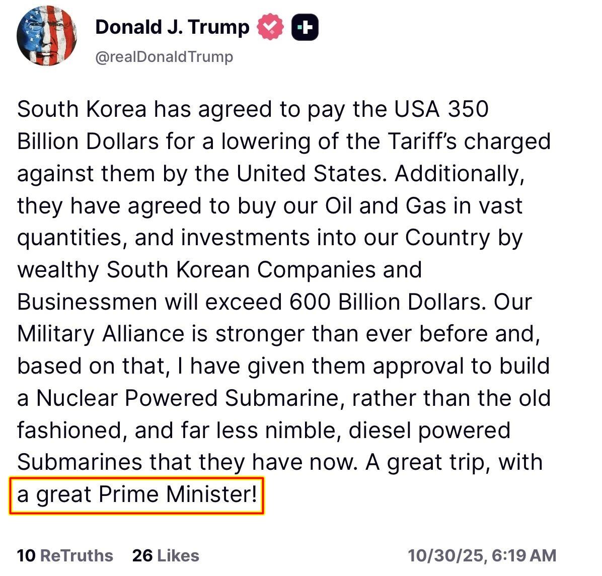트럼프는 30일 트루스소셜에 한미 정상회담 결과에 대한 글을 쓰며 “훌륭한 총리(a great Prime Minister)와 함께한 훌륭한 방문이었다”고 적었다. 이 대통령을 ‘총리’로 잘못 표기한 것이다. 이후 트럼프는 이 부분을 ‘훌륭한 한국의 대통령’(a great President of South Korea)으로 수정했다.