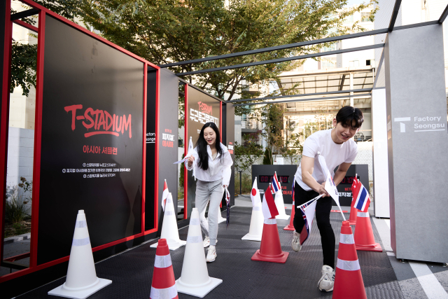 전시는 내달 30일까지 한 달간 진행한다. T팩토리 성수 실내 공간은 물론 실외 마당까지 활용해 규모감 있게 프로그램을 구성했다. 방문객들은 체력을 기르고 구독 혜택을 찾는 도전의 경기장 ‘T-스타디움’에서 ‘득근(근육을 얻는다는 뜻)’ 리플렛을 받고 5가지 피지컬 훈련에 참여할 수 있다.