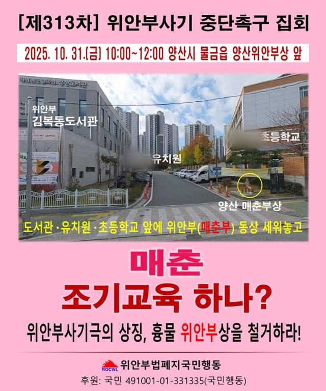 양산경찰서는 위안부법폐지국민행동이 경남 양산 A초등학교 정문 건너편 인도에서 '위안부 사기 중단 촉구 집회' 집회를 열겠다고 지난 27일 신고한 것에 대해 제한통고 조치를 내렸다.