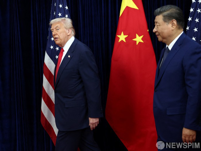 [부산 로이터=뉴스핌] 도널드 트럼프 미국 대통령과 시진핑 중국 국가주석이 30일 부산 김해국제공항 나래마루에서 기념촬영을 마치고 이동하고 있다. 2025.10.30 photo@newspim.com