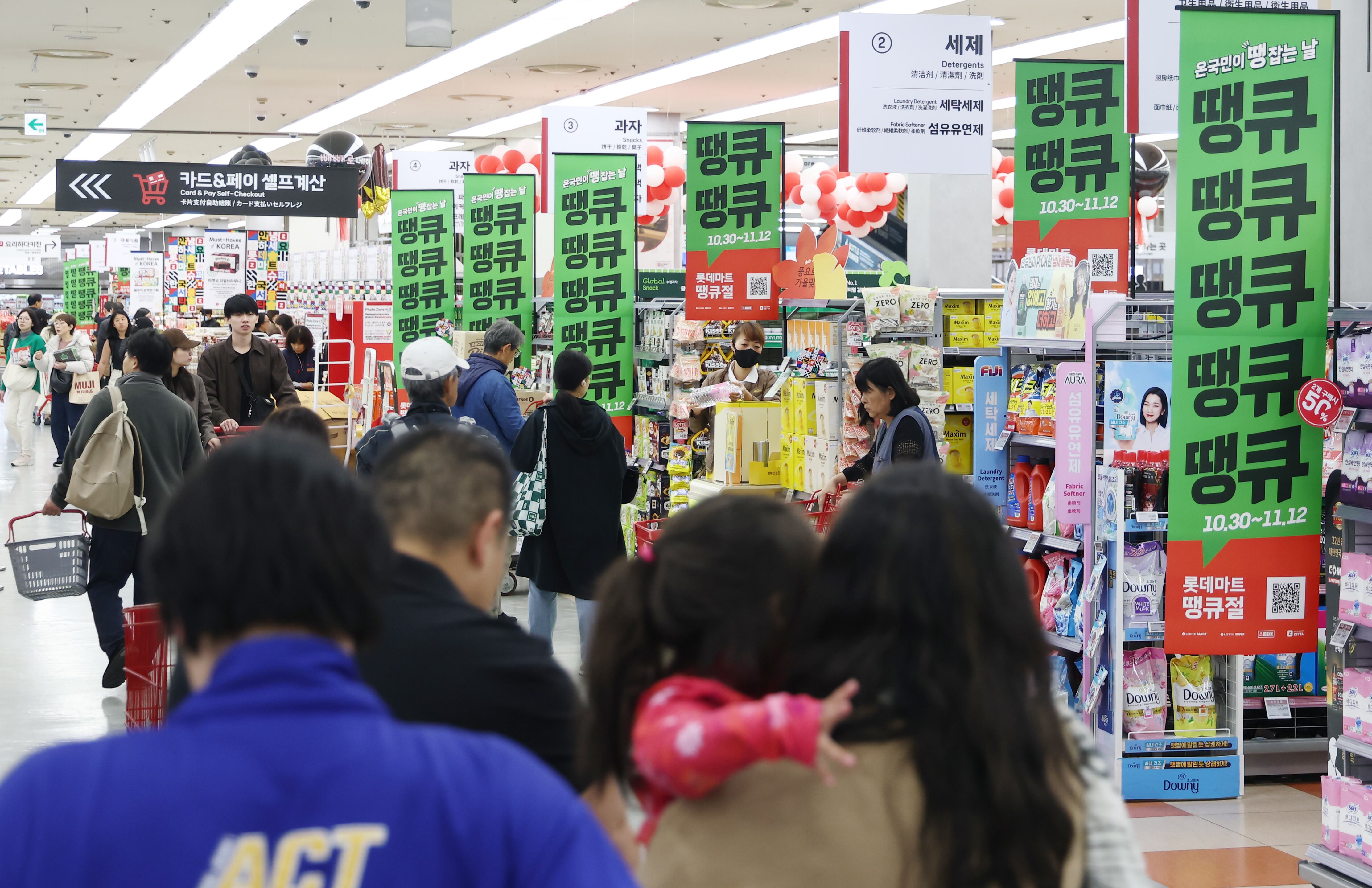 한국판 블랙프라이데이인 '코리아 그랜드 페스티벌’이 시작된 29일 서울의 한 대형마트에 관련 대형 할인행사 안내 현수막이 걸려 있다./연합뉴스 |