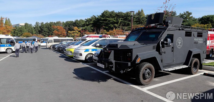 [경주=뉴스핌] 류기찬 기자 = 아시아태평양경제협력체(APEC) 정상회의에 참석하는 다카이치 사나에 일본 총리 방한일인 30일 오전 다카이치 총리의 숙소로 알려진 경북 경주시 라한셀렉트 경주에 경찰특공대 차량이 배치되어 있다. 2025.10.30 ryuchan0925@newspim.com
