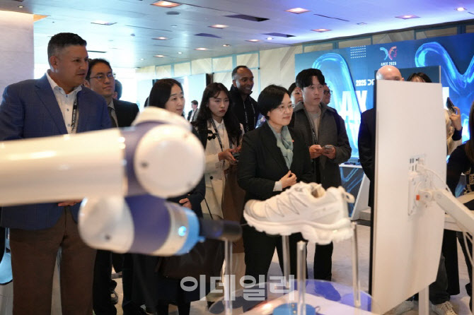 [이데일리 이영훈 기자] 한성숙 중소벤처기업부 장관(가운데)이 28일 서울 광장동 워커힐호텔에서 열린 '글로벌 초격차 테크 콘퍼런스'에서 스카이인텔리전스 기술 체험존에서 로봇암 기술 설명을 듣고 있다. (사진 제공:스카이인텔리전스)