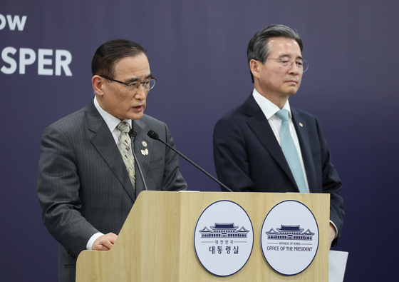 위성락 대통령실 국가안보실장(왼쪽)이 지난 29일 경북 경주 APEC 국제미디어센터에서 한미 정상회담 관련 브리핑을 하고 있다. 오른쪽은 김용범 정책실장. 대통령실사진기자단 |
