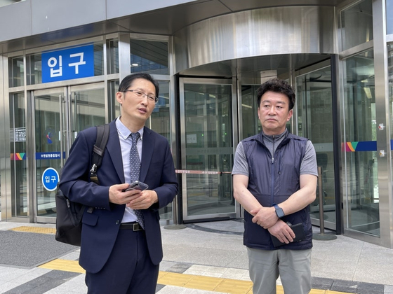 '이춘재 연쇄살인 사건' 중 9차 사건 용의자로 몰렸다가 또 다른 성범죄 사건에 연루돼 징역형을 선고받았던 고(故) 윤동일씨 친형인 윤동기씨(오른쪽)와 재심사건 변호인인 박준영 변호사가 취재진과 인터뷰하고 있다. 연합뉴스 |