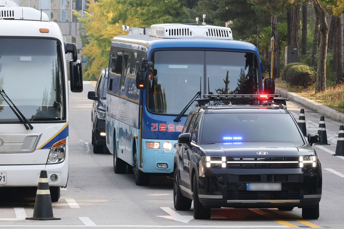윤석열 전 대통령이 탑승한 호송차량이 30일 오전 서울 서초동 서울중앙지방법원에 도착하고 있다. [뉴스1] |