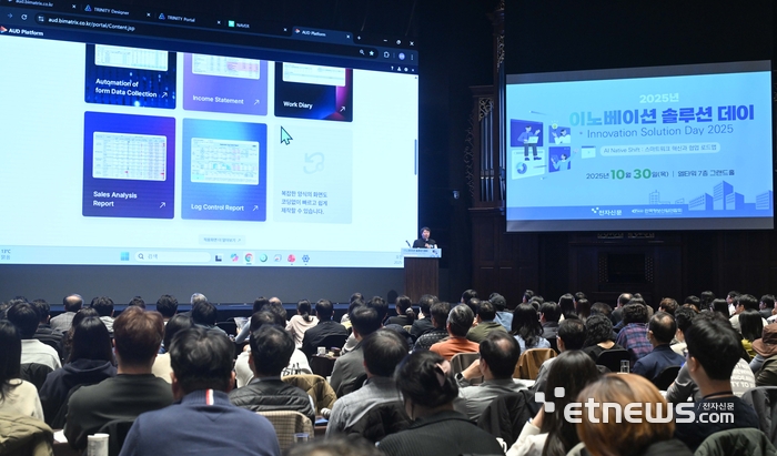 한국정보산업연합회와 전자신문이 공동 주최한 2025년 이노베이션 솔루션 데이가 30일 서울 서초구 엘타워에서 열렸다. 이정수 NHN 두레이 책임이 '두레이! 통한 AX 성공 사례 및 전략'에 대해 기조강연 하고 있다. 박지호기자 jihopress@etnews.com |