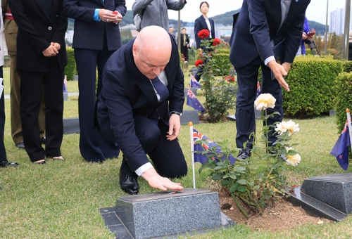 (부산=연합뉴스) 특별취재단 = 경주 아시아태평양경제협력체(APEC) 정상회의를 계기로 방한한 크리스토퍼 럭슨 뉴질랜드 총리가 30일 오후 부산 남구 유엔기념공원 내 뉴질랜드 참전비를 찾아 참배했다.