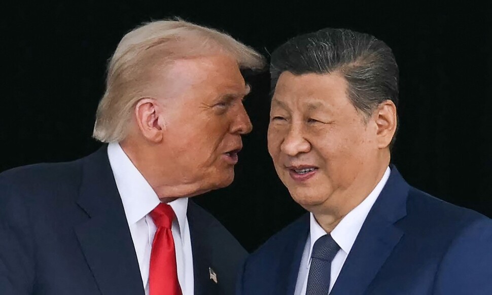 30일 김해국제공항 내 의전 시설 나래마루에서 비공개 정상회담을 마치고 나온 도널드 트럼프 대통령과 시진핑 중국 국가주석. 트럼프 대통령이 귓속말을 건네자 시 주석이 웃으며 답하고 있다. AFP 연합뉴스 |