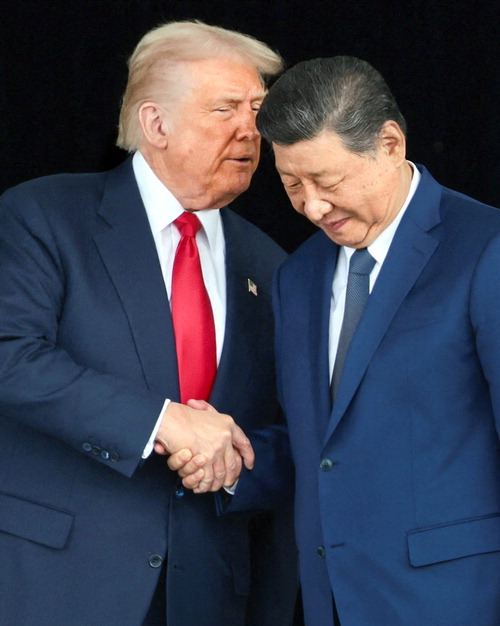 무슨 얘기 나눴을까 … 美中 정상의 '귓속말' 도널드 트럼프 미국 대통령(왼쪽)과 시진핑 중국 국가주석이 30일 부산 김해공항 공군기지 나래마루에서 1시간40분간 정상회담을 갖고 관세전쟁의 격화를 자제하기로 합의했다. 6년 만에 다시 만난 두 정상이 회담장을 나오며 악수하고 있다. 이때 트럼프 대통령이 시 주석에게 귓속말을 건넸고, 시 주석은 살짝 웃으며 고개를 끄덕였다. AFP연합뉴스 |