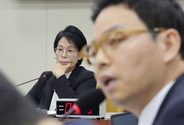 더불어민주당 소속 최민희(왼쪽) 국회 과학기술정보방송통신위원장이 30일 서울 여의도 국회의사당에서 열린 과방위의 종합 국정감사 도중 박정훈(오른쪽) 국민의힘 의원의 발언을 듣고 있다. 뉴스1 |