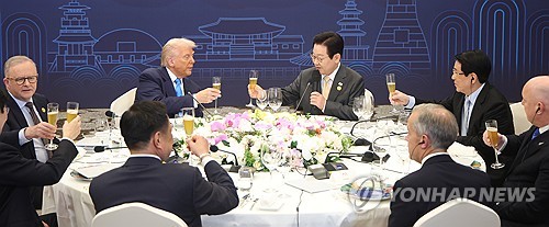 건배하는 이재명 대통령과 트럼프 대통령, 앨버니지 호주 총리 |