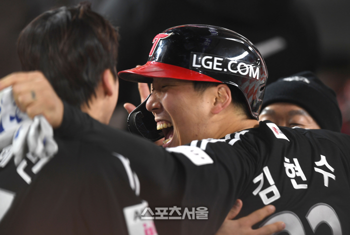 LG 김현수가 30일 대전 한화생명볼파크에서 열린 2025 KBO 한국시리즈 4차전 한화와 경기 9회초 2사2,3루 2타점 우전안타를 친 후 교체되어 더그아웃에서 동료들과 환호하고 있다. 대전 | 최승섭기자 thunder@sportsseoul.com |