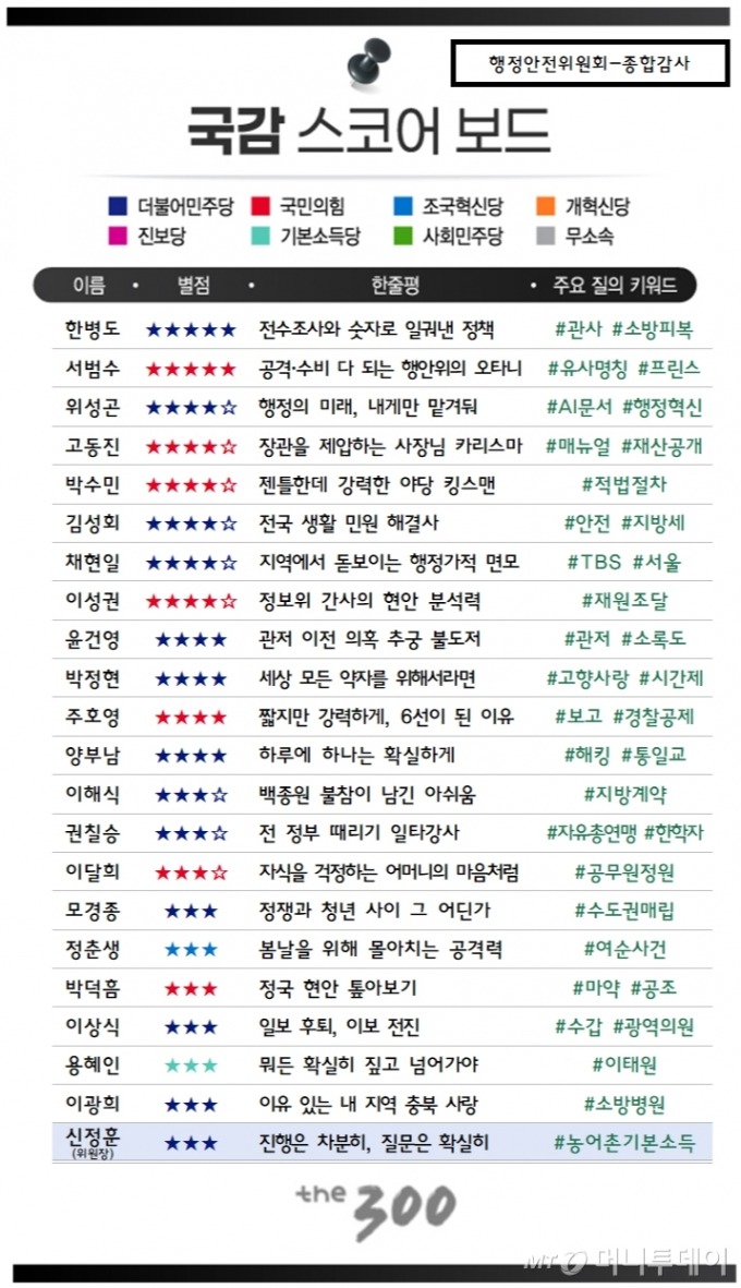 한편 머니투데이 더300[the300] 국감 스코어보드의 평가 기준은 △정책 전문성 △이슈 파이팅 △국감 준비도 △독창성 △국감 매너 등이다.