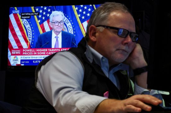 29일(현지시간) 미국 뉴욕증권거래소(NYSE) 거래장에서 한 트레이더가 업무를 보는 가운데, 뒤편 스크린에서 제롬 파월 미 연방준비제도(Fed) 의장이 기준금리 인하 발표 후 기자회견을 하는 모습이 방영되고 있다. 로이터연합뉴스 |