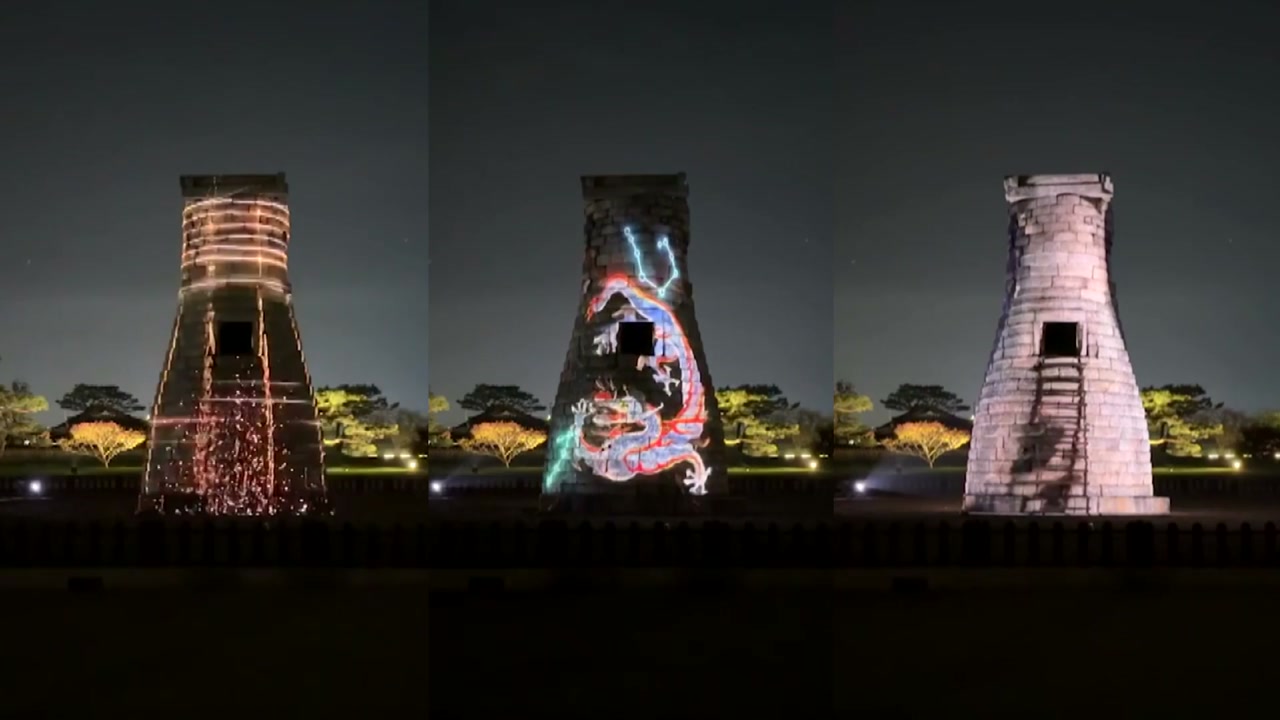 신라의 대표적 유물 첨성대가 다양한 전통 문양으로 둘러싸입니다.