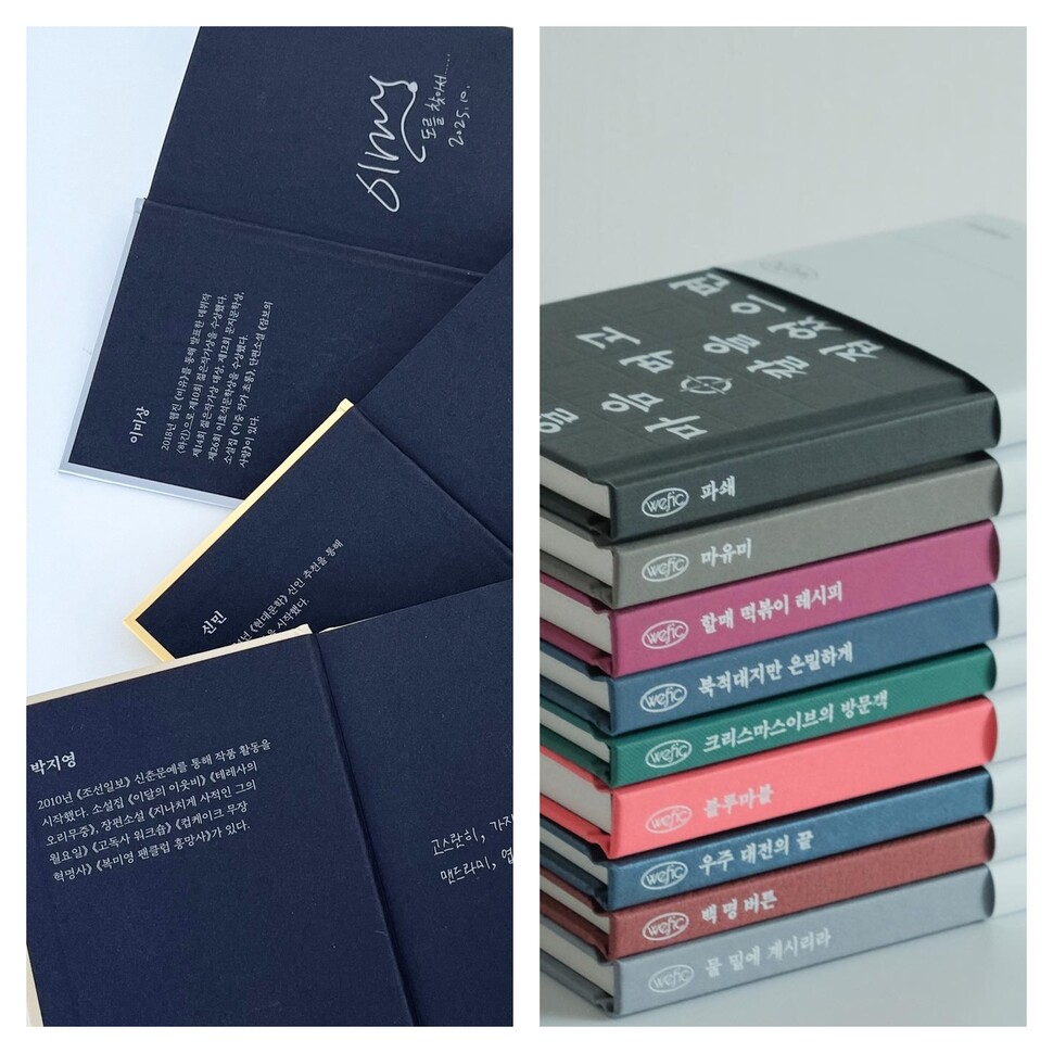 위픽 시리즈로 2023년 3월부터 출간한 첫 10종(오른쪽)과 ‘시즌 2’를 마무리하며 최근 발간한 98~100번째 작품의 내지. 위즈덤하우스 제공 |