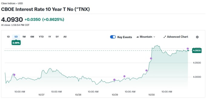 미 국채 10년물 금리 차트, 자료=야후 파이낸스, 2025.10.31 koinwon@newspim.com |