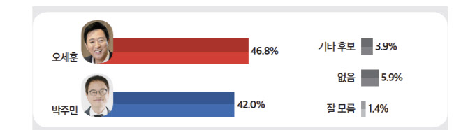 오 시장과 박 의원을 가상대결에 붙였을 땐 오 시장 46.8%, 박 의원 42.0%로 오차범위 내 승부를 벌였다. 오 시장은 강북동권을 제외한 나머지 권역에서박 의원 지지율을 앞섰다. 이번 조사에선 오 시장과 박홍근·서영교·전현희 민주당 의원 간 가상대결도 진행했는데 △오세훈 46.7% 박홍근 35.9% △오세훈 47.6% 서영교 40.4% △오세훈 47.4% 전현희 39.0%로 모두 오 시장이 오차범위 밖에서 우세했다.