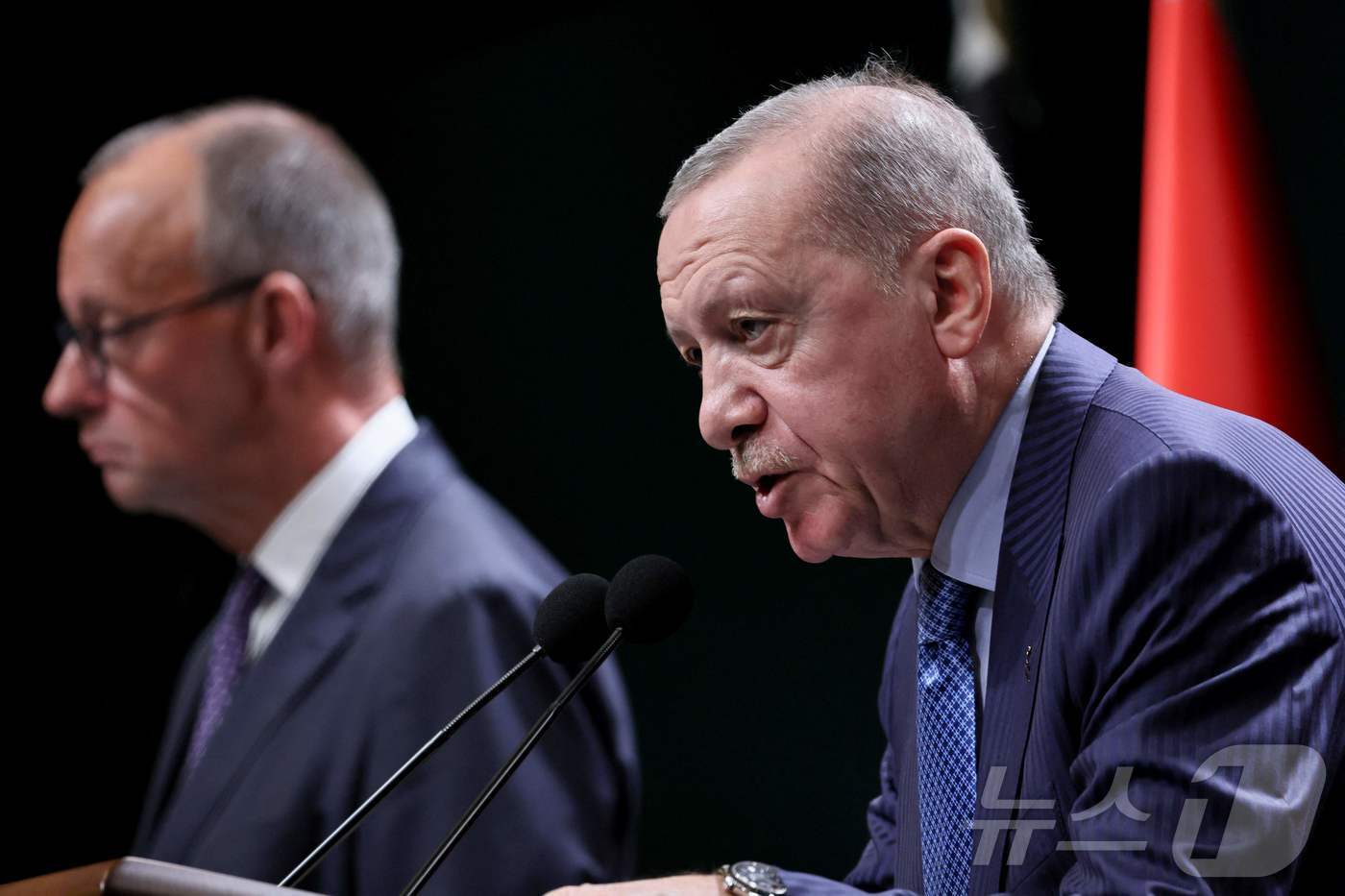 30일(현지시간) 튀르키예 앙카라 대통령궁에서 레제프 타이이프 에르도안 튀르키예 대통령(오른쪽)과 프리드리히 메르츠 독일 총리가 공동 기자회견을 열었다. 2025.10.30.ⓒ AFP=뉴스1 |